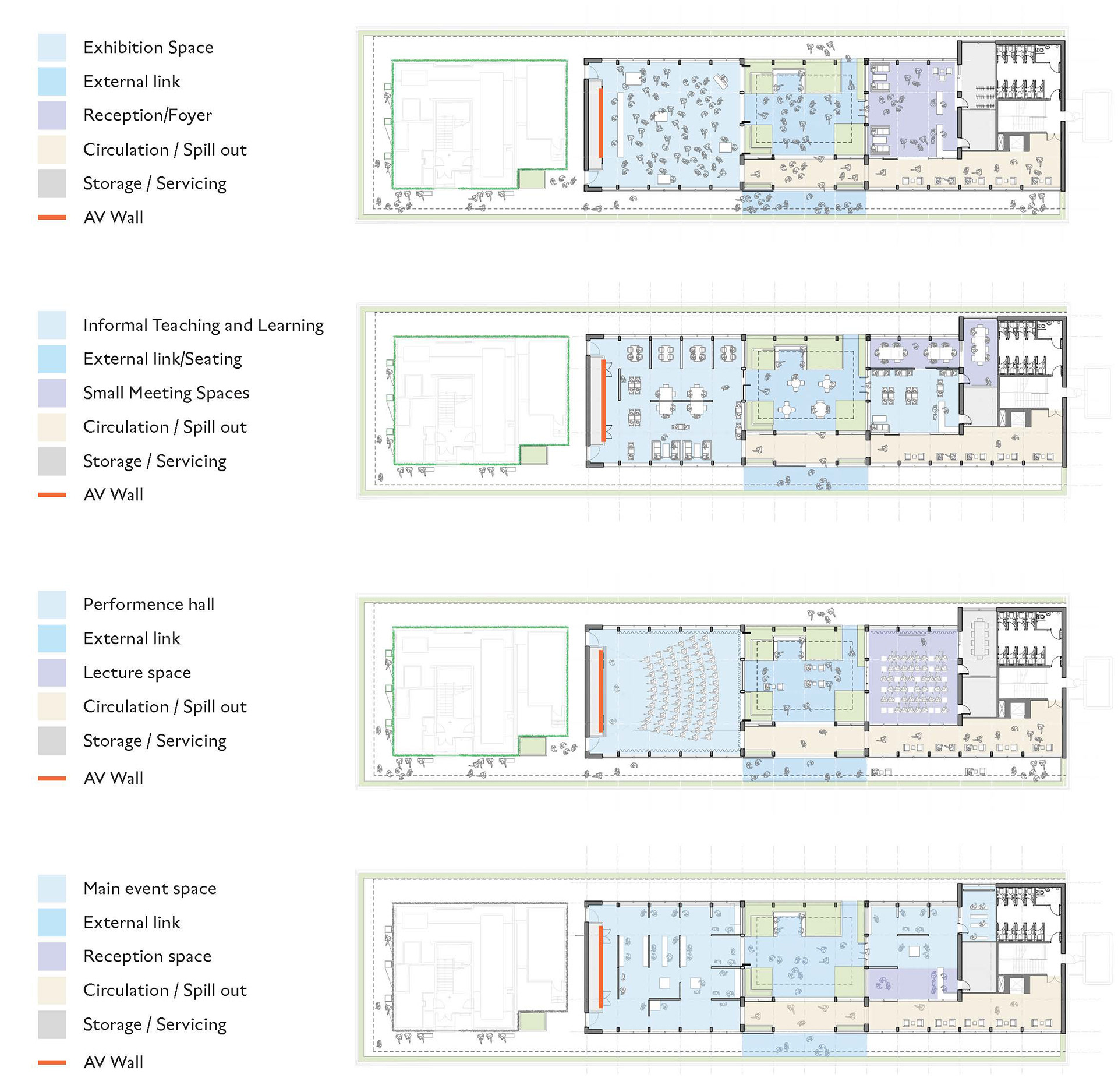 The Pavilion is designed to be prefabricated in 3x3m modules, with a railing system that is part of the beam and column tectonic build up. This system ensures that the spaces have the highest level of flexibility, allowing for the easy erection of partitions, hanging elements or light fittings. The spatial sequencing is organised as a series of rooms, the ‘Common Room’ a smaller more informal study space, intended to be for more intimate sized groups and classes, but with the infrastructure to become one larger space if needed. The ‘Green Room’ acts a buffer but also functionally adds a green outside space, for spill outs and events. The large room can be quickly subdivided to accommodate a variety of uses, like: exhibitions, lectures, performances or end of year shows.
